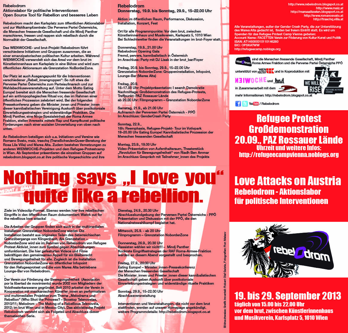 Rebelodrom ist der Name für ein Aktionslabor (in- und outdoor, bzw. im Netz) das melodramatische Interventionen in spezifischen öffentlichen und politischen Handlungsräumen in Wien entwickelt und realisiert.